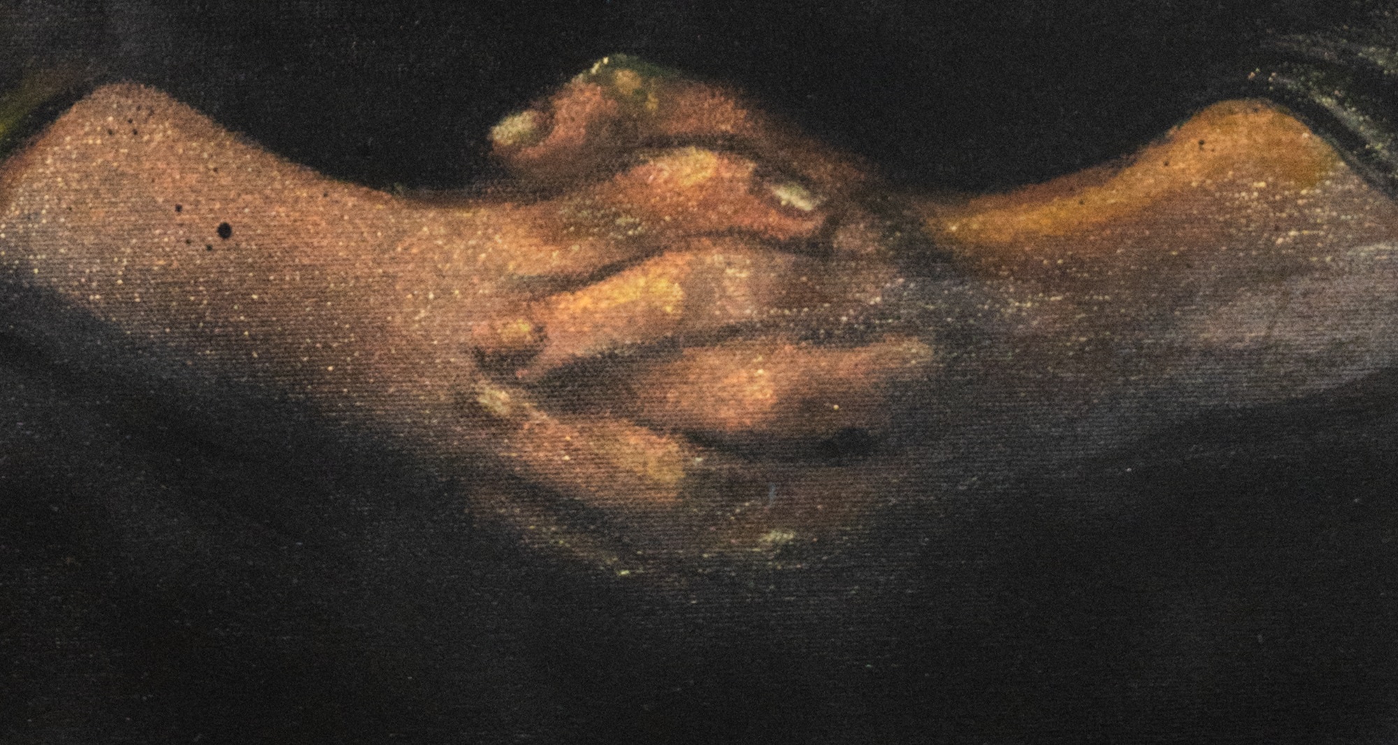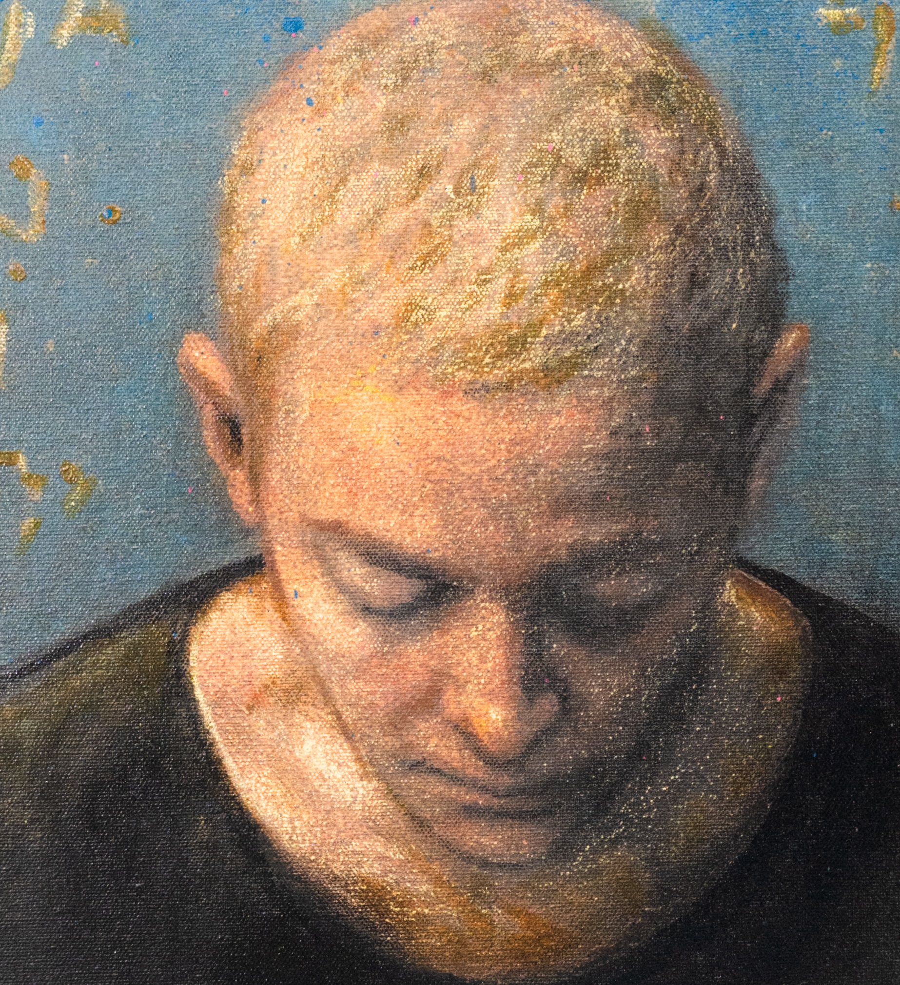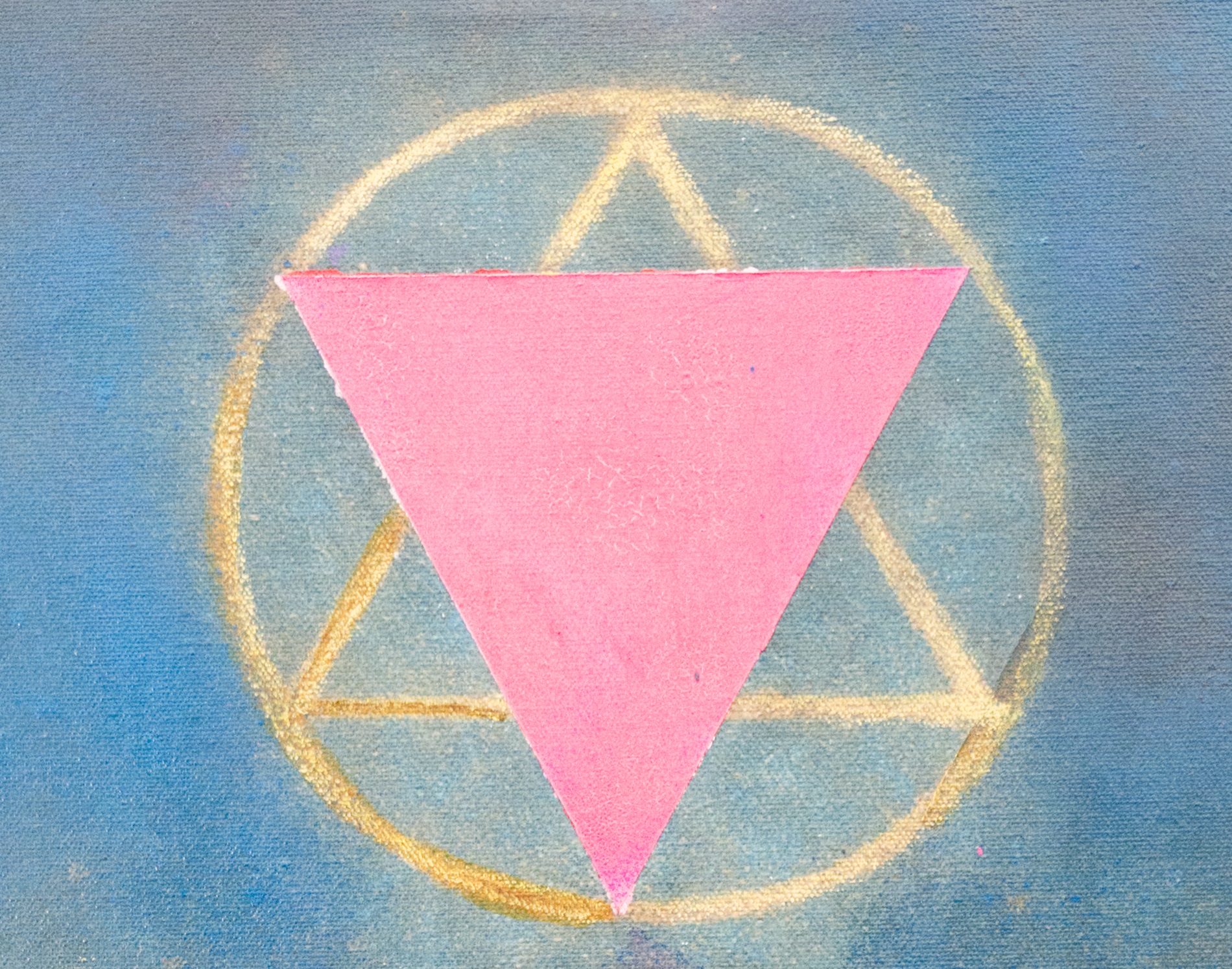 “Pink Try” by Irina Sigitova is a contemplative exploration of vulnerability, transformation, and the quiet resilience of the human spirit. At the center of the composition sits a solitary figure, head bowed and hands clasped in a gesture that hovers between prayer and surrender. The simplicity of their black garment contrasts sharply with the luminous symbols surrounding them — a golden geometric circle framing a pink downward triangle. The background’s muted blue dissolves into gold inscriptions, evoking sacred languages or forgotten codes, suggesting that the act of introspection itself is a kind of spiritual ritual.