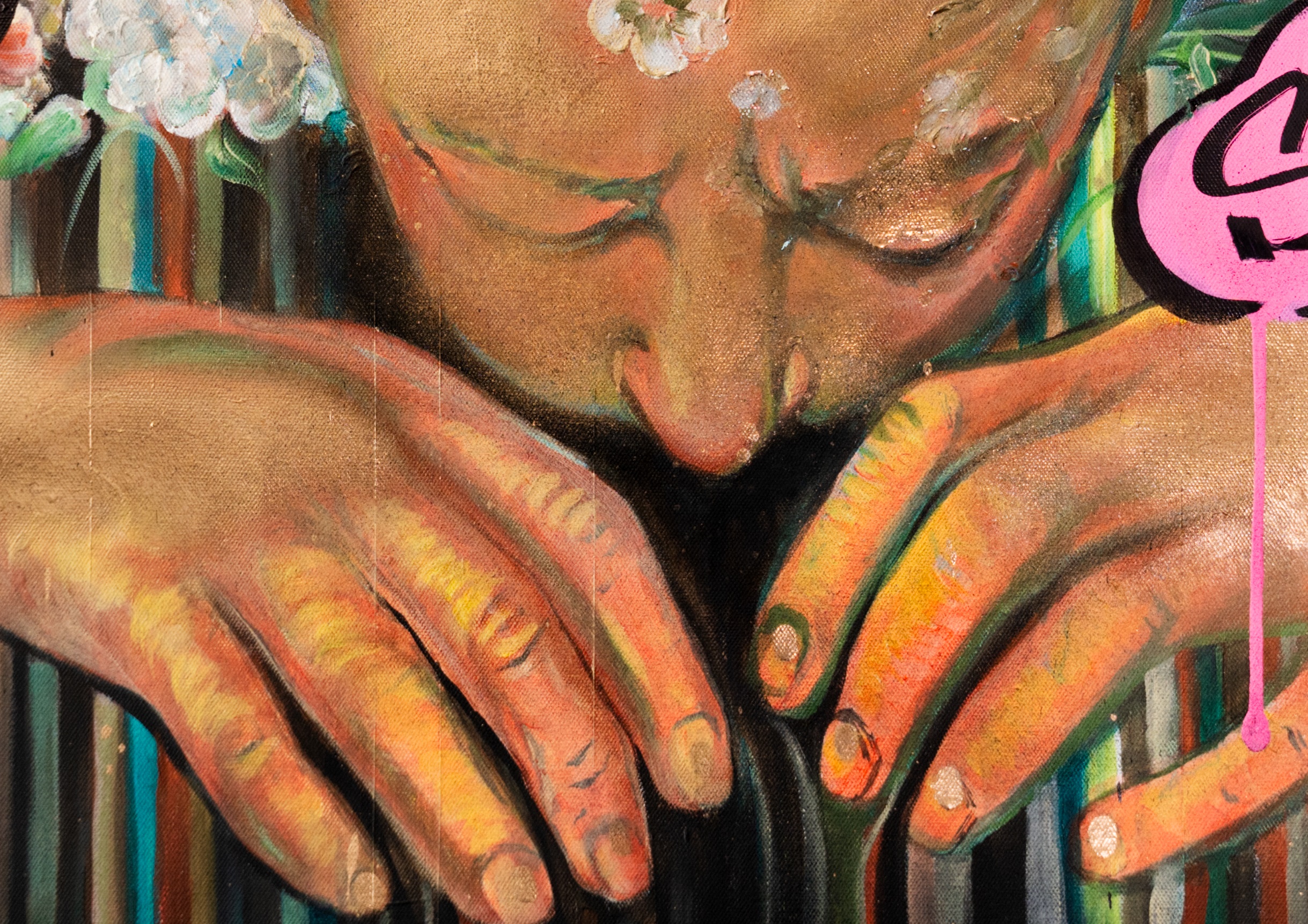 “Still Life – Still Me” by Irina Sigitova is a deeply introspective and emotionally charged work that redefines the concept of a still life. Traditionally, still life painting freezes inanimate objects — flowers, fruits, vessels — as symbols of transience and mortality. Sigitova subverts this convention by placing a living, breathing subject at its center: a human figure caught between vitality and stasis. With their head bowed and hands suspended, the figure appears to dissolve into a cascade of color, as if melting into the canvas itself. The effect is both tender and unsettling — a meditation on identity fading into the background of existence.
