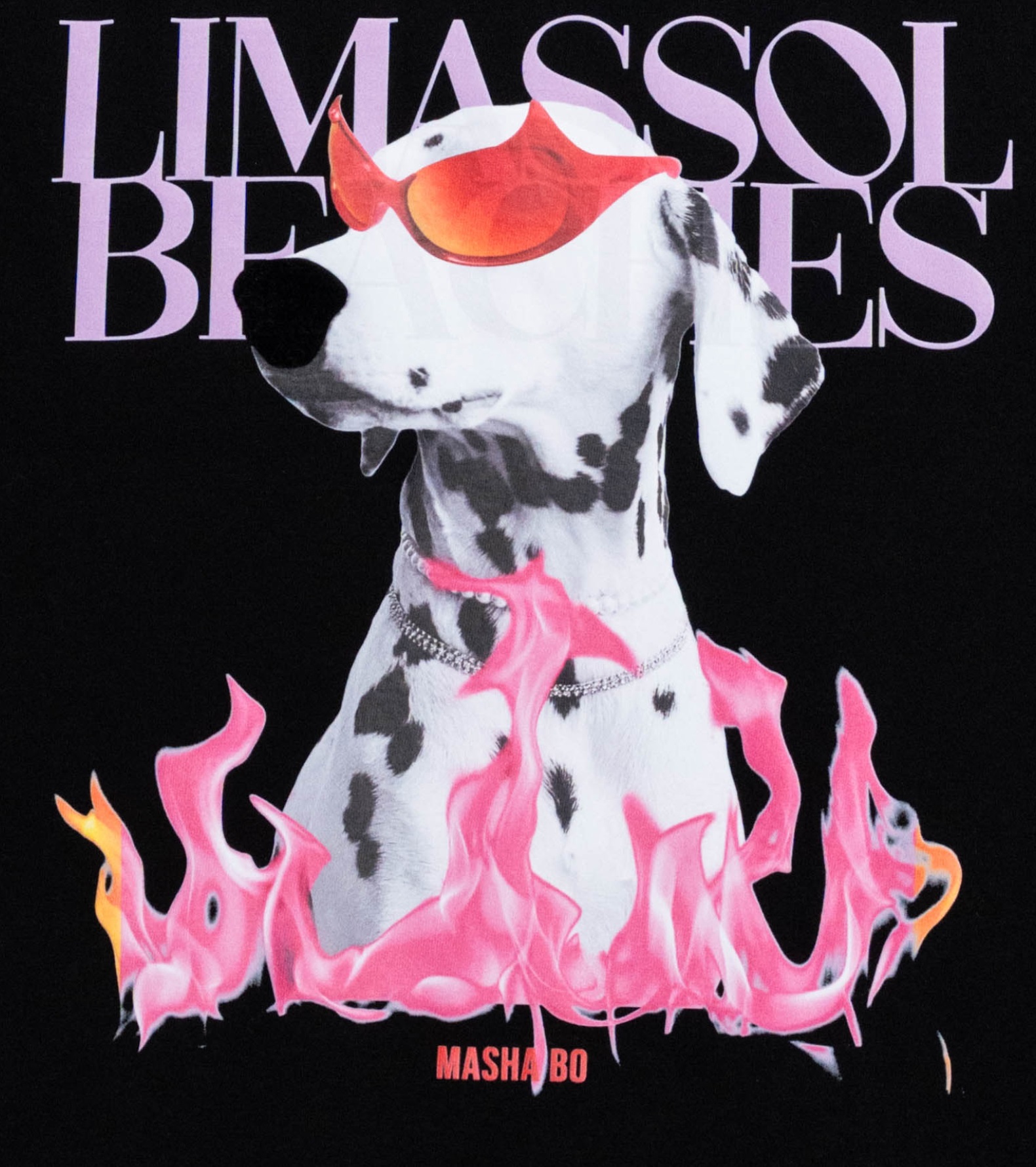 Fire Beach by Masha Bo — a bold, ultra-contemporary graphic built on irony, attitude, and a touch of chaos. The black tee amplifies the artwork: a Dalmatian in flaming neon-pink heat waves and oversized futuristic shades, staged under the iconic LIMASSOL BEACHES typography. Masha Bo mixes pop-surreal humor with editorial sharpness, turning the image into a fashion statement with a rebellious coastal twist.