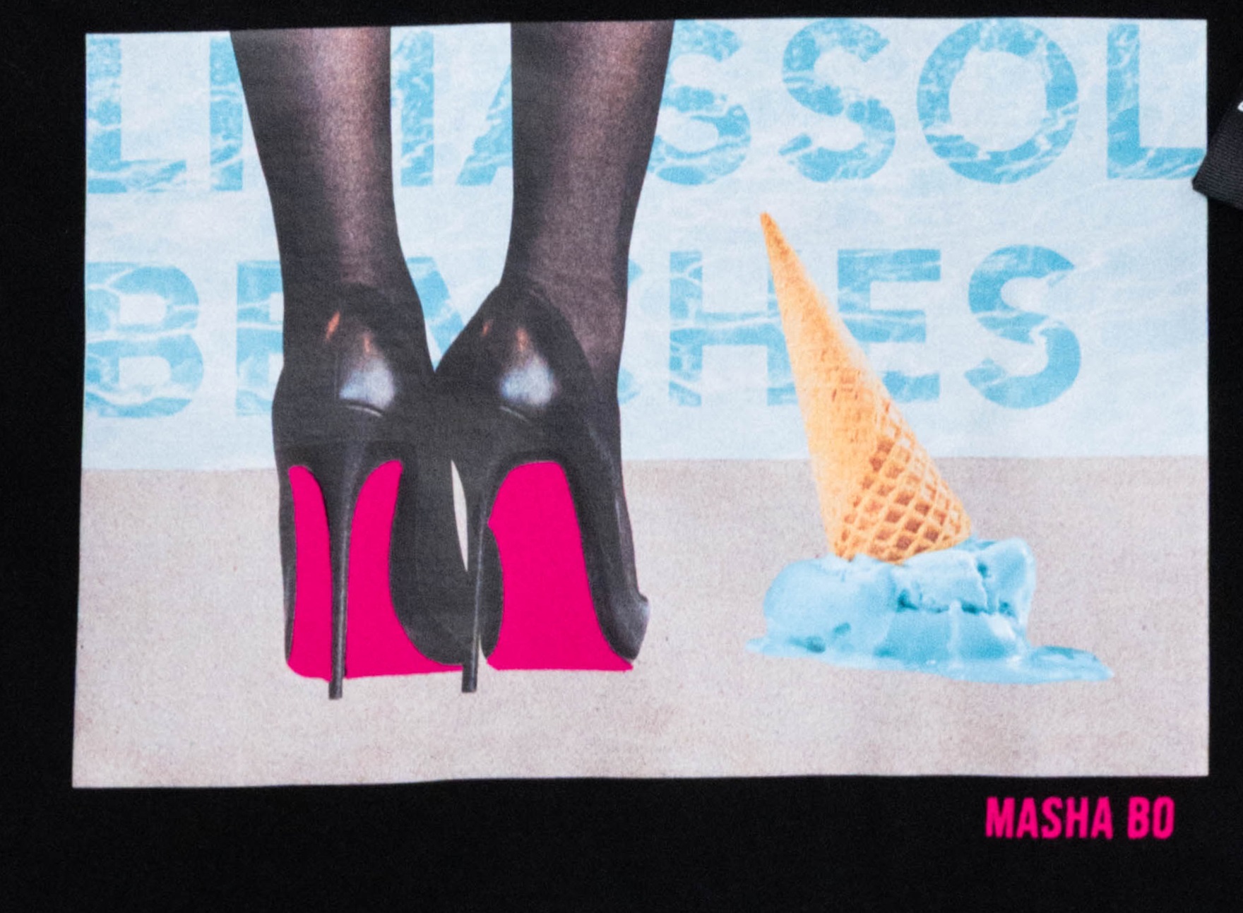 Melting Interest by Masha Bo — a sharp, fashion-driven visual punch that blends humor, attitude, and pop-surrealism. The black tee becomes a dramatic stage for Masha Bo’s signature contrast work: glossy heels, beach sand, and a melting ice-cream cone collapsing under the heat of Limassol. The composition delivers her trademark mix of irony and editorial aesthetics, turning an everyday T-shirt into a provocative art object.